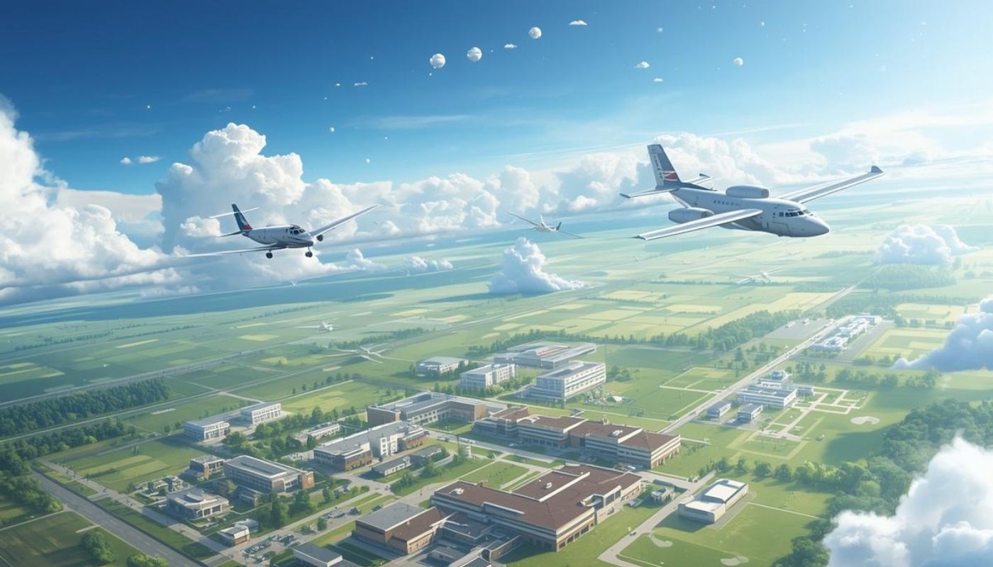 The training zone includes classrooms, flight simulators, briefing rooms, hangar‑based practical training spaces, and controlled flight areas, enabling structured skill development from basic flight theory to advanced pilot and technical courses aligned with global aviation standards.